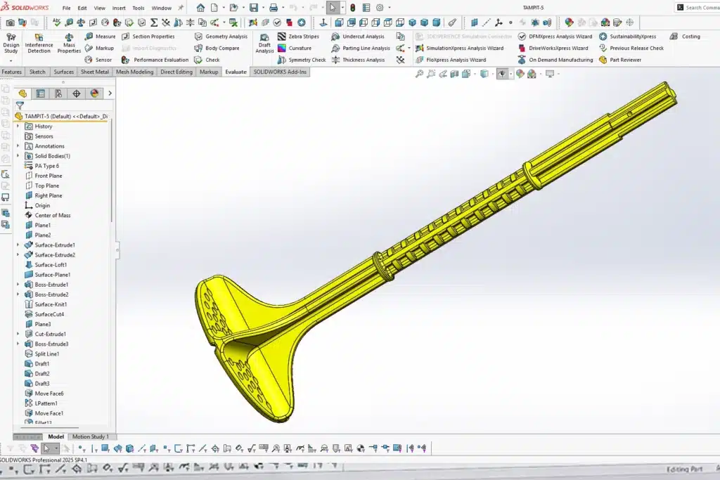 SolidWorks and Fusion 360 are used to develop precise geometry with attention to advanced surface modeling, dimensional tolerancing, and design-for-manufacturing considerations. Digital models are built to support engineering collaboration and production readiness.